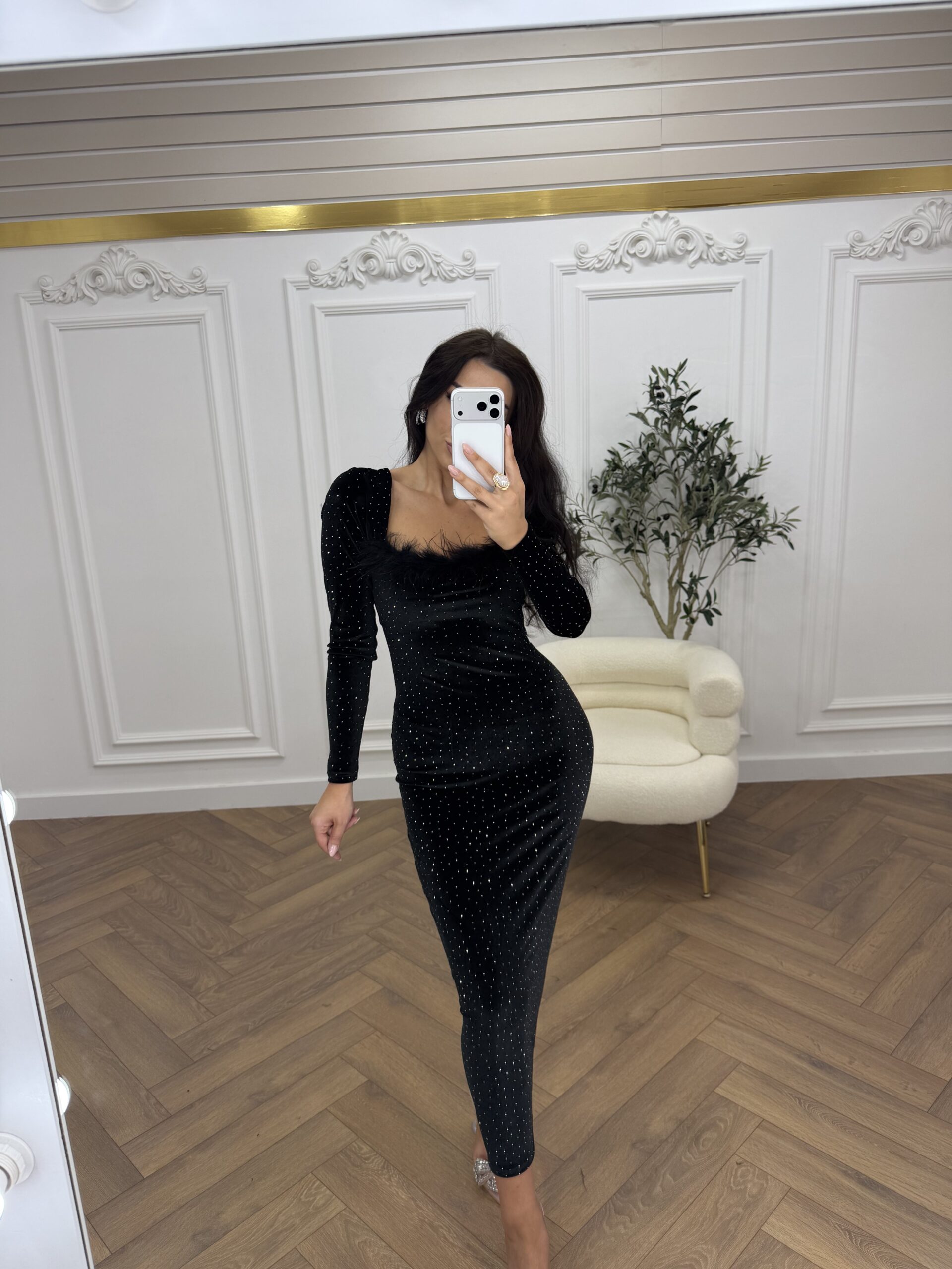 Midi haljina od elastičnog pliša sa cirkonima i detaljem perja